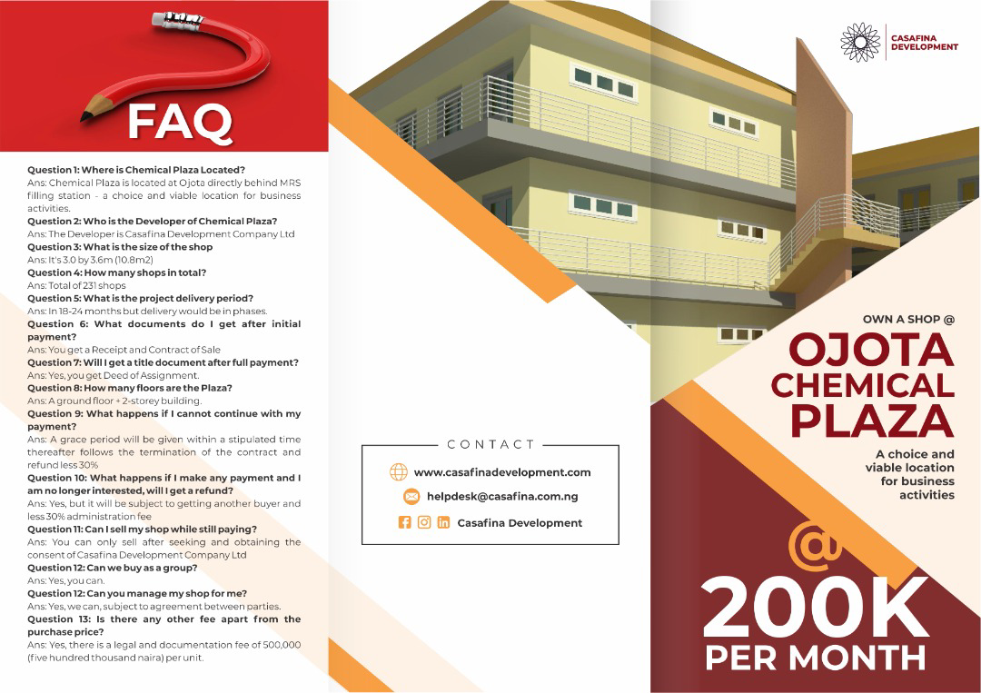 We have a very flexible payment structure of 335k per month for 36 months this makes it easier for an average investment-minded person to own a shop within a plaza located at Ojota car park